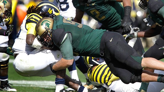 Sparty In "Bronze"- I didn't know that old gold, or "Bronze" as Nike was calling it, was one of Michigan State's school colors. Their colors are green and white. Last year, they added gold trim to the numbers on the jerseys and yesterday they came out with gold helmets and numbers and black pants. I think they would have looked better without the gold, but Michigan saved the day with some sweet road throwbacks in their school colors. I am not a big fan of teams wearing "special" jerseys every week. If they do, It would be nice if they used their school colors. No matter what you think of Maryland's new uniform combinations, they all include the Terps' school colors. There is one exception to every rule, and since they were first, Oregon gets to be that exception. The Pirate Duck look from Saturday was good. Silver helmet, black jersey, silver pants. Too bad they probably won't wear it for another ten years.